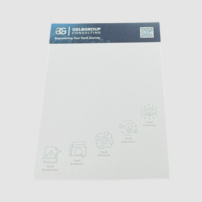 Be sure to take advantage of the full-colour print customization. It is recommended that the imprint area be no larger than 50% of the page size so that there is maximum writing space for the end-user. The sticky note pad contains 40 sheets of white paper with each individual page adorned with the branding of your choosing. It also contains a backing paper as the last page and an adhesive that can be positioned on any one side of the sticky note pad.