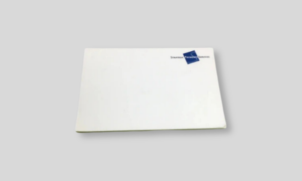 The sticky notes pads contain 40 sheets of paper that can be printed on, a backing paper as the last page, and an adhesive strip that can be positioned on any one side of the sticky note pad.