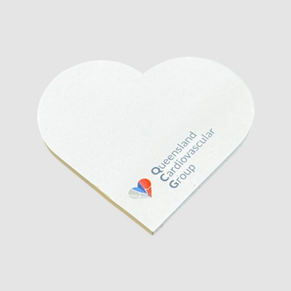 Buy promotional sticky notes in the shape of an Angled heart. These custom shaped sticky notepads are cut from a rectangle sized sticky note measuring: 70mm x 68mm. Our product is made and custom printed in Australia.