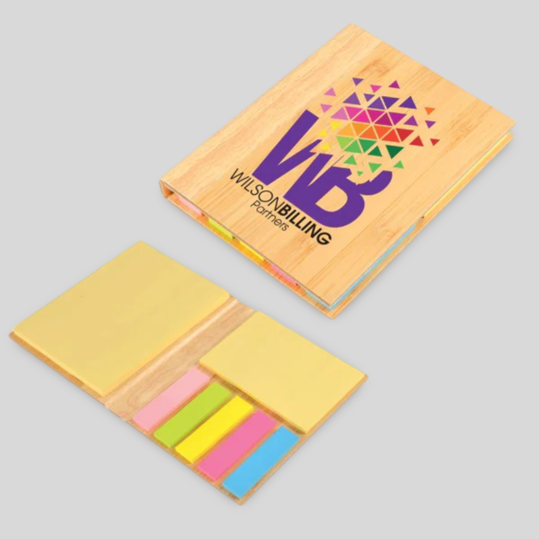 Zentara Bamboo Sticky Notes is your go-to for eco-chic organisation. This compact promotional sticky notes book, adorned with a beautiful bamboo veneer cover, brings a touch of nature to your desk. Inside, you'll find an array of colourful options for marking, highlighting, and jotting down quick notes. It features five blocks of vibrant noteflags (25 leaves each) for those important reminders, alongside two blocks of sunny yellow notes—one sized 75 x 50mm with 25 leaves for your everyday memos, and a larger block sized 98 x 75mm with 50 leaves for those notes that need a bit more space. With Zentara Bamboo Sticky Notes, staying organised is not just easy, it's also a statement of your eco-conscious style.